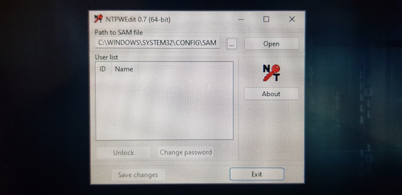 Setelah itu, silahkan search di start menu "NT Password Edit" lalu buka, kalian akan melihat aplikasi itu seperti foto di bawah.